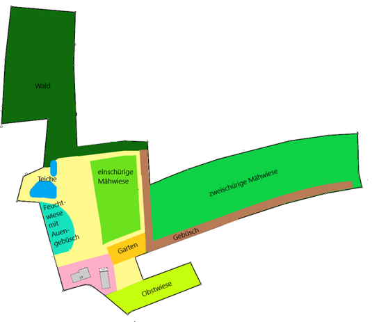 Einzelbäumen umgeformt, um eine artenreiche Magerwiese zu erhalten. Lediglich einige wenige Durchgangsbereiche werden häufiger gemäht. Obstwiese und Garten werden zu einem Lebensraum für