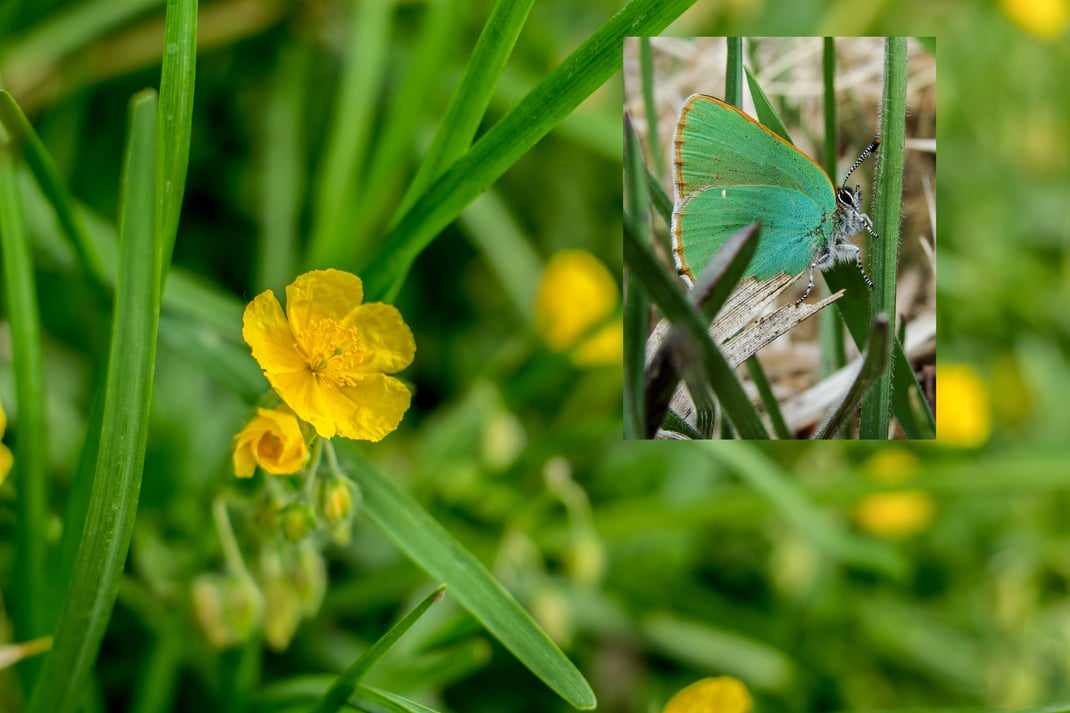 Der grüne ZIpfelfalter bevorzugt als Nahrungspflanze für seine Nachkommen das Sonnenröschen