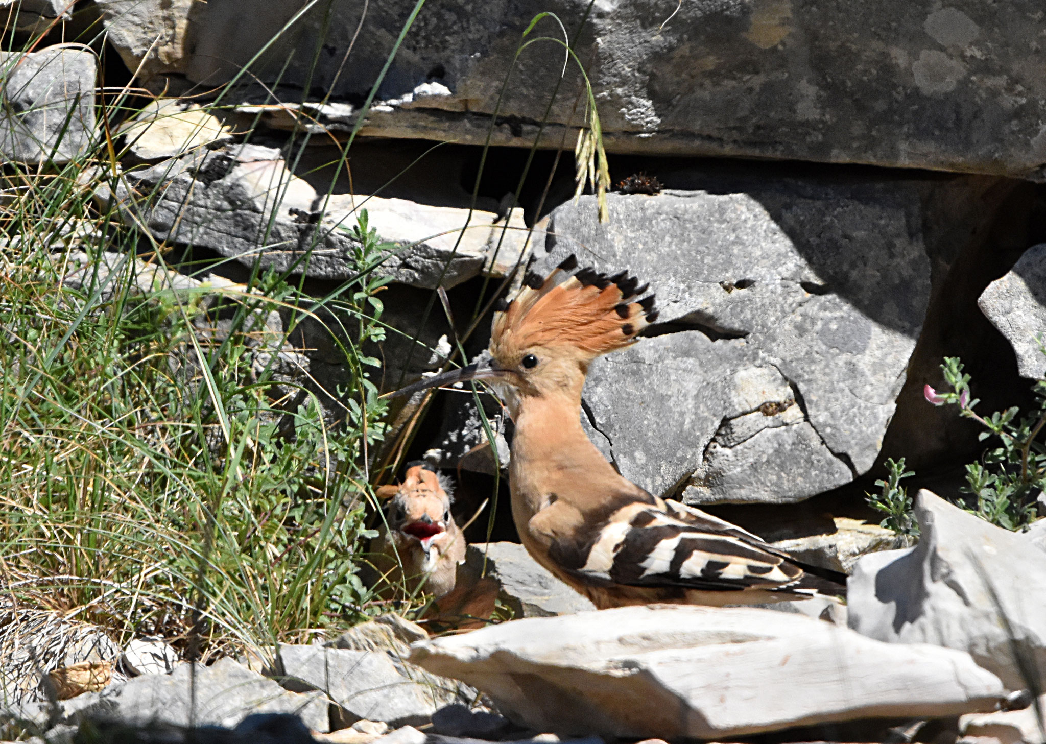 Von jetzt an beobachten wir immer wieder die Wiedehopfe. Im Abstand von wenigen Minuten erscheint je ein Elternteil mit Futter, verschwindet mit dem Vorderkörper in der Höhle, sodass nur noch der