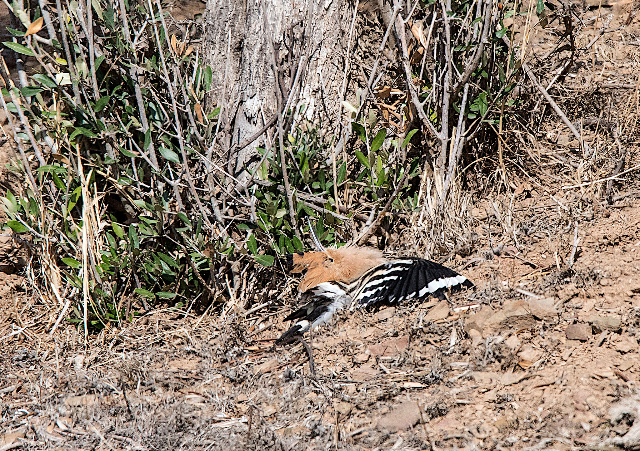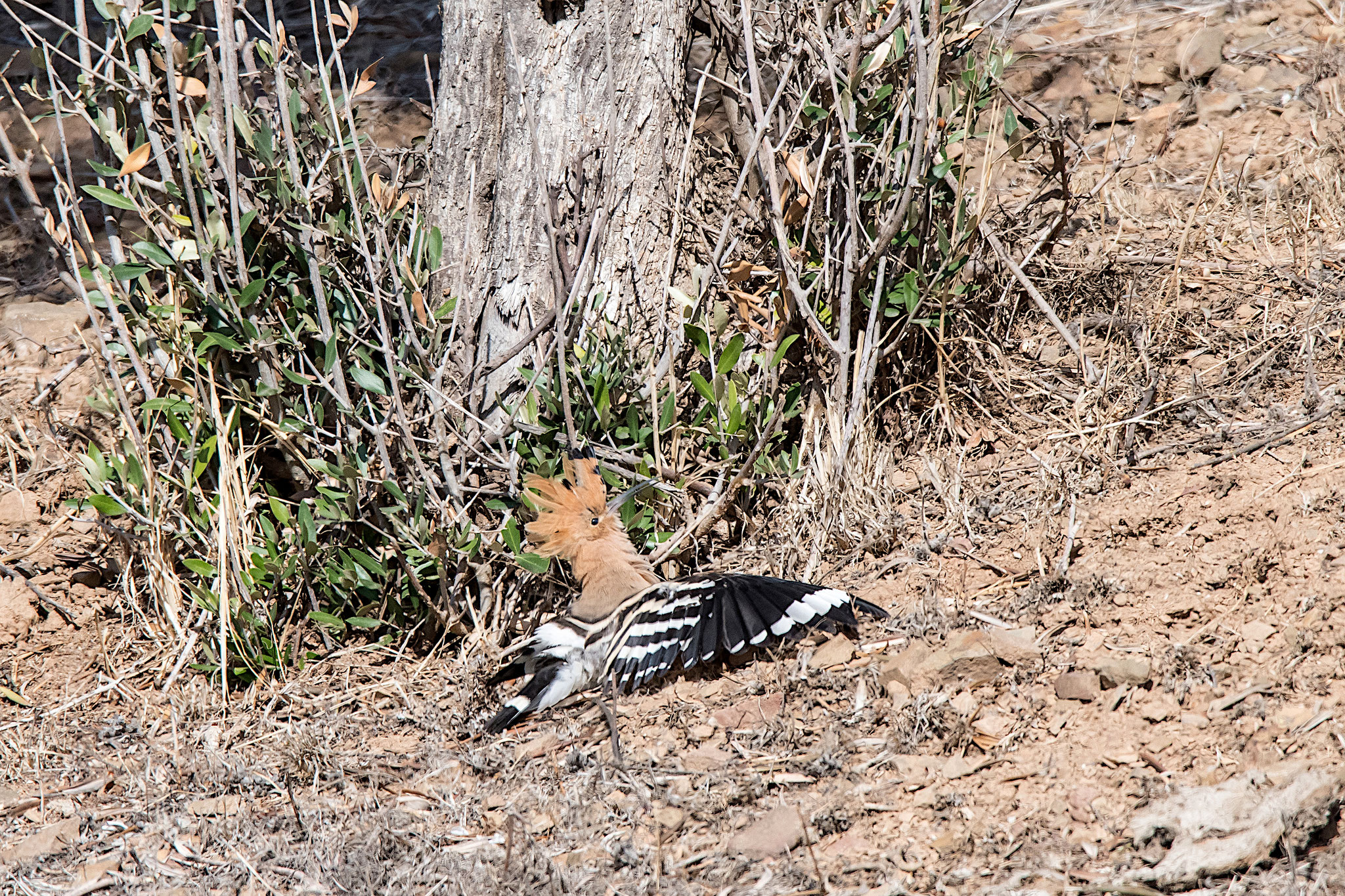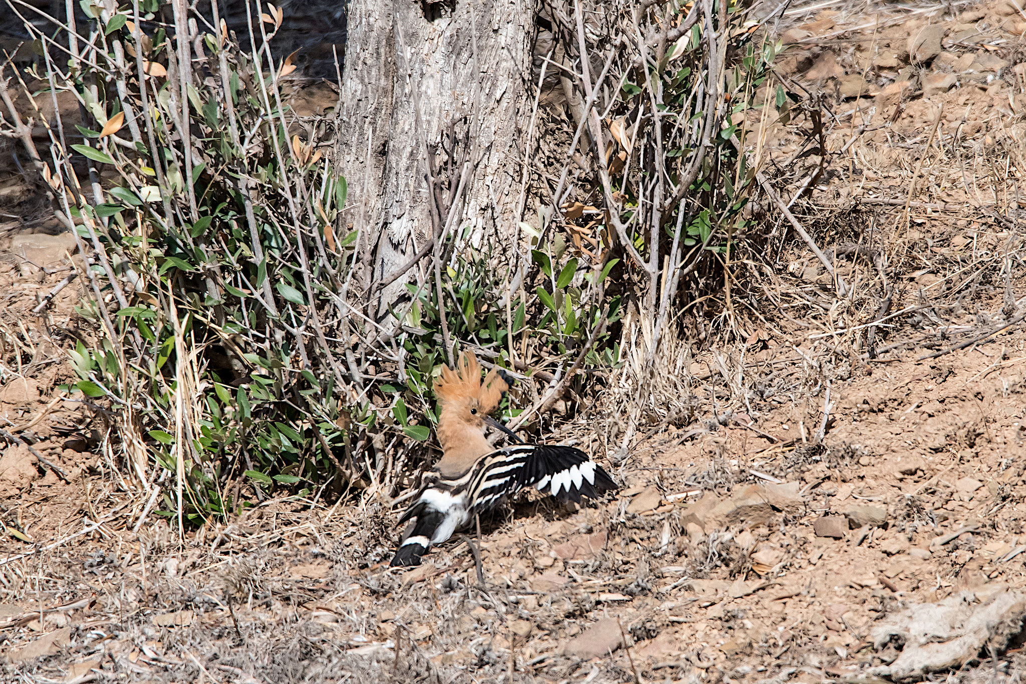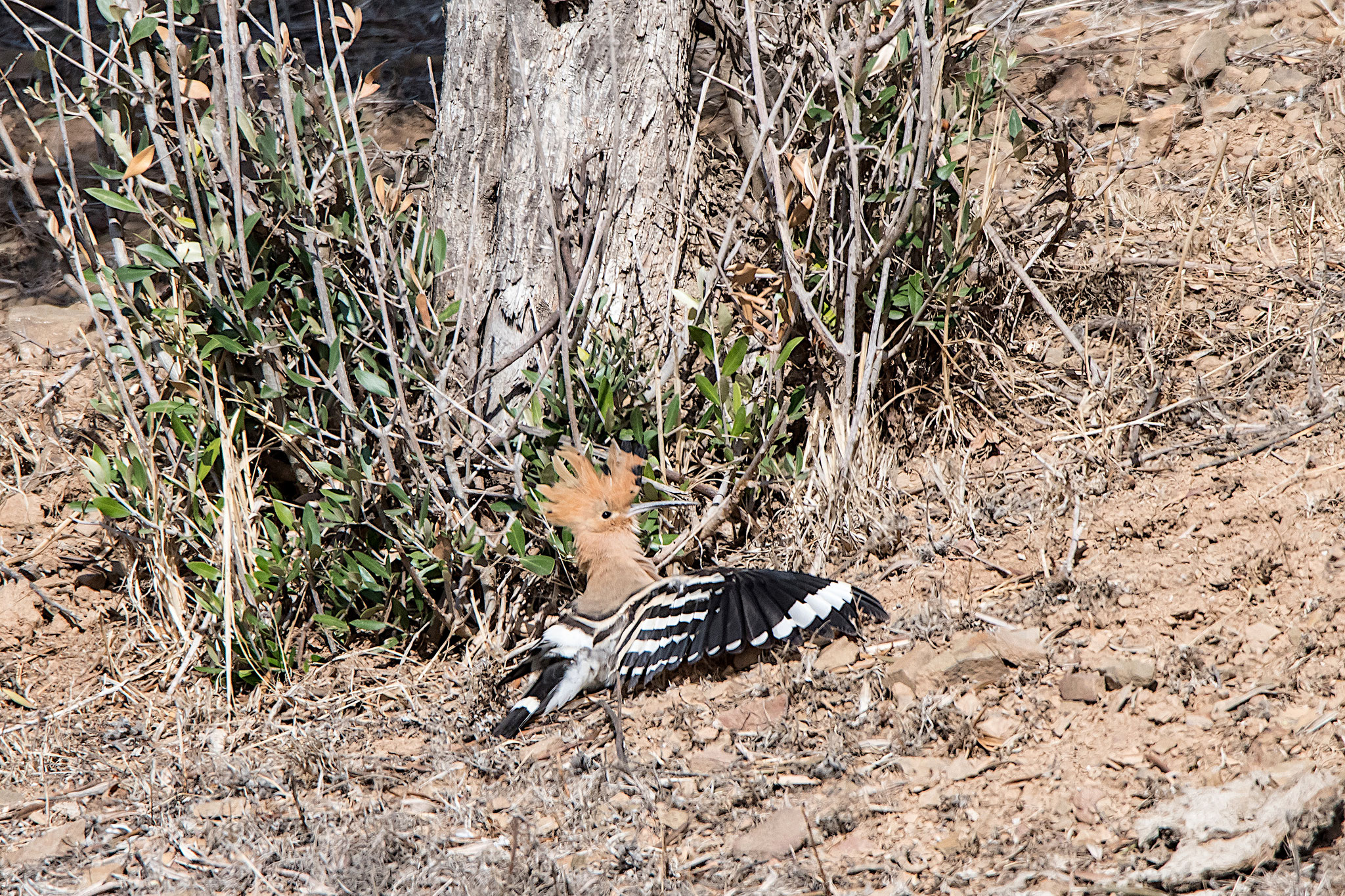 zwischen Steine und schließlich legte er sich am Fuße eines Baumstammes auf den Boden. Jetzt begann die Show: Flügel öffnen, abspreizen; Federhaube aufstellen, dann den Kopf soweit in den Nacken