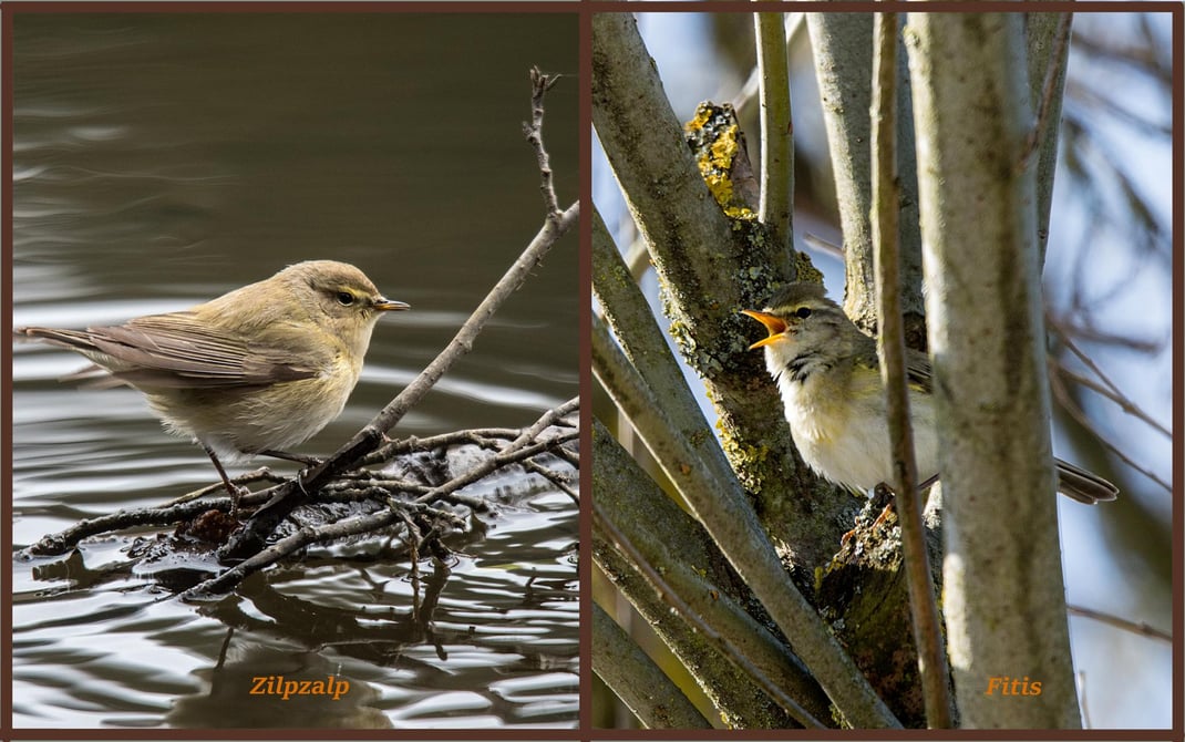 Zilpzalp und Fitis: Das sind zwei unscheinbare grau-grün gefärbte Laubsängerarten, kleiner als eine Kohlmeise. Sie huschen ruhelos im Geäst von Sträuchern und Bäumen auf der Suche nach Insekten,