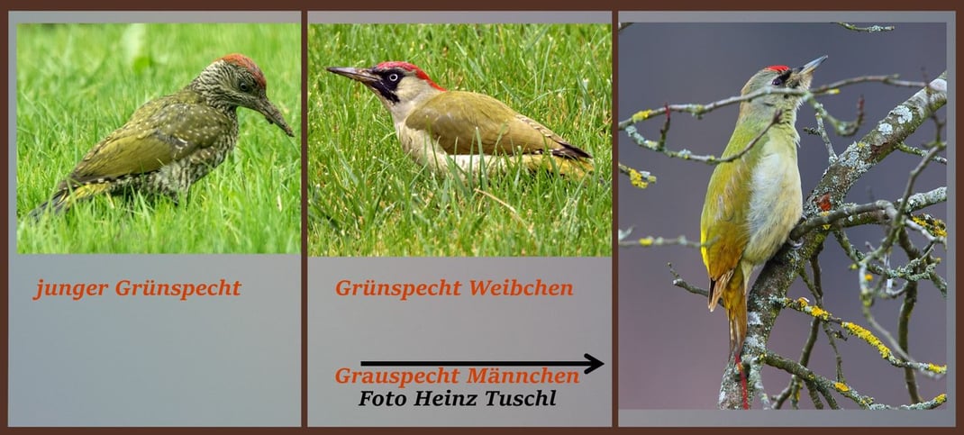 Grün- und Grauspecht: Beide Arten sind größer als eine Amsel, in grünlichem Federkleid und suchen gerne auf offener Wiesenfläche nach Ameisen im Boden, auf die sie spezialisiert sind und